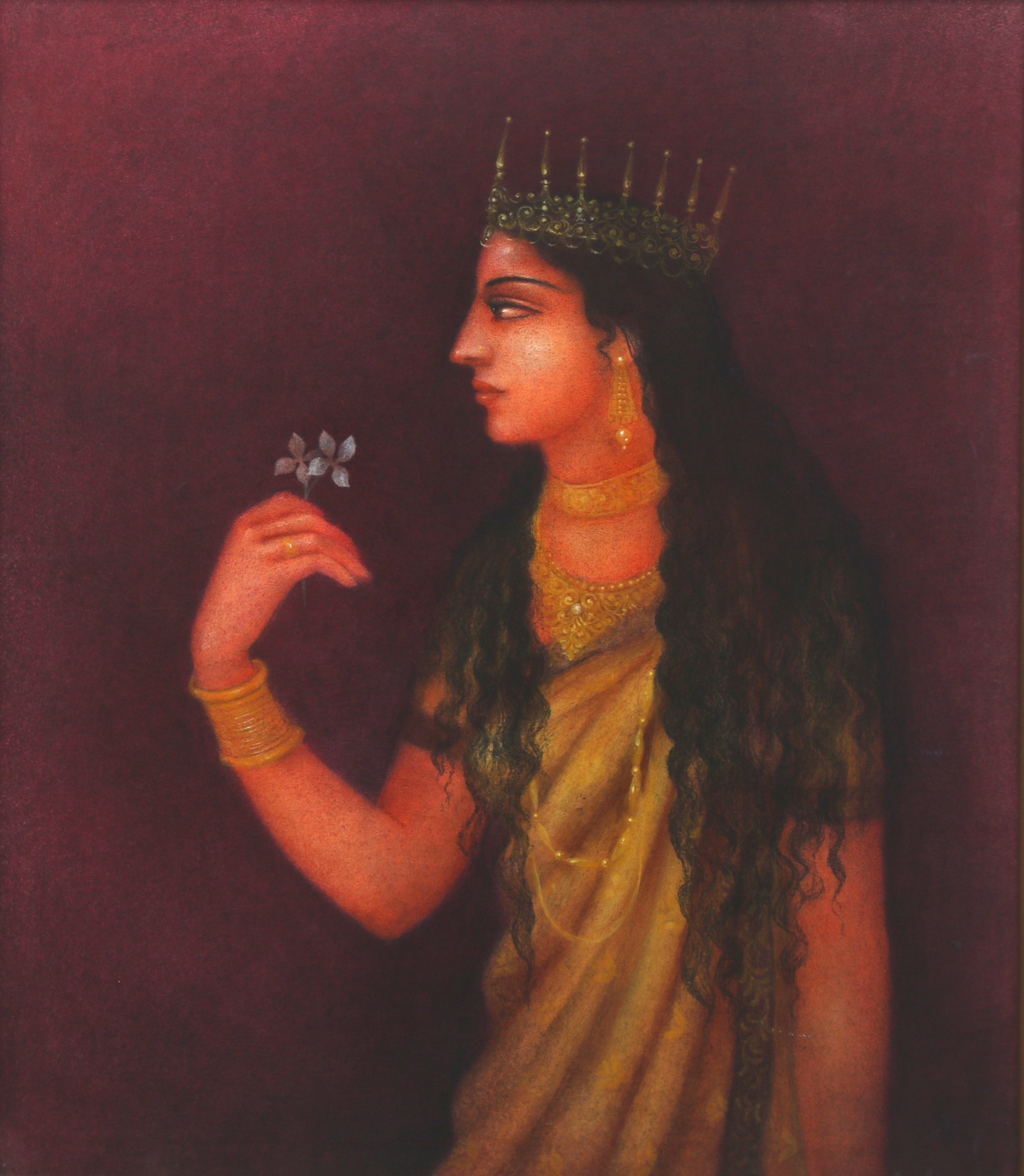 Bratin Khan was born in West Bengal, 1969, he is an eminent artist, who is highly influenced by Folk art, Bengal School of Art and Rajasthani miniatures paintings, evident in his brushstrokes and the way he handles colour. He graduated in painting from Visva Bharati University, Shantiniketan.