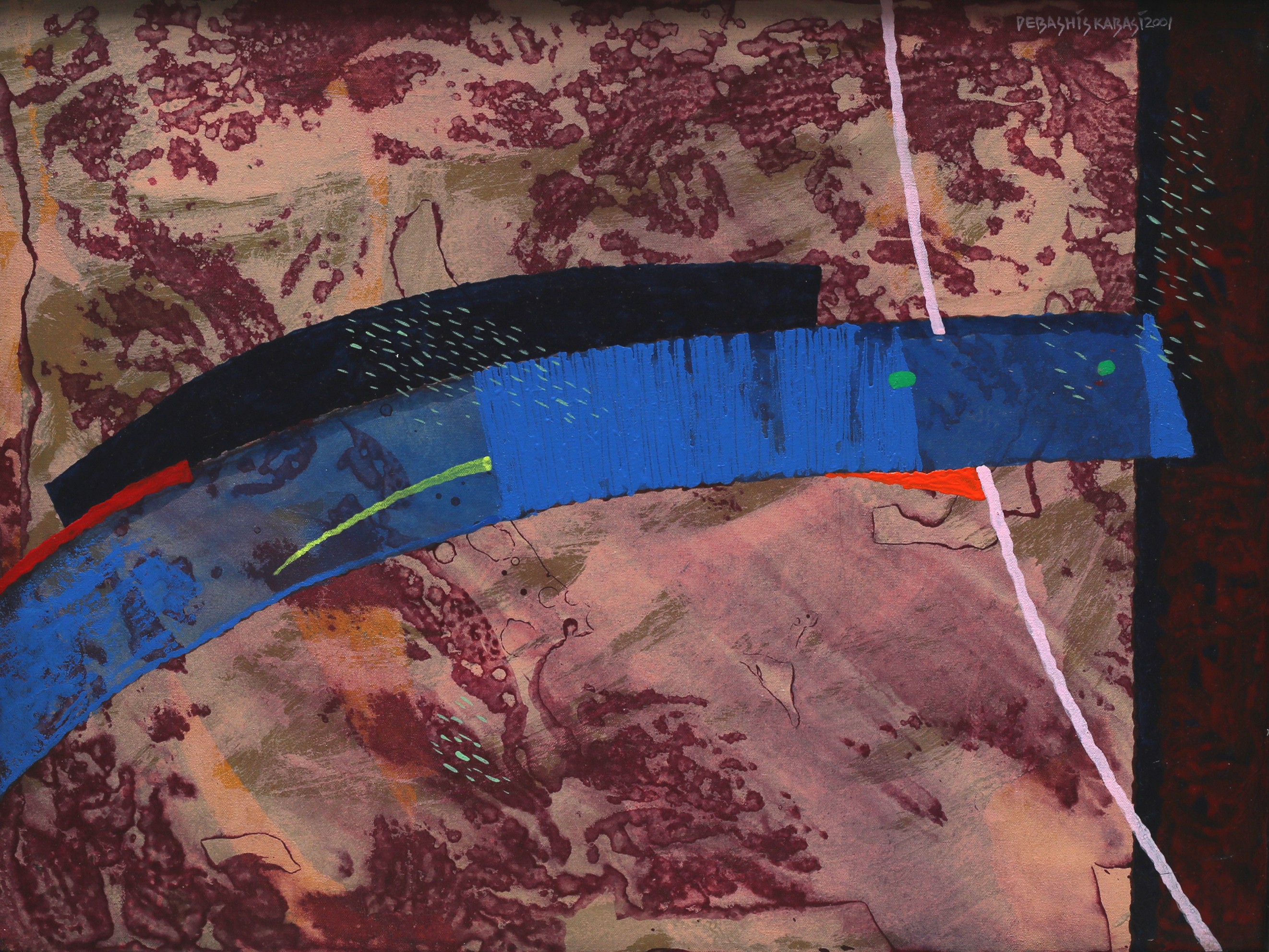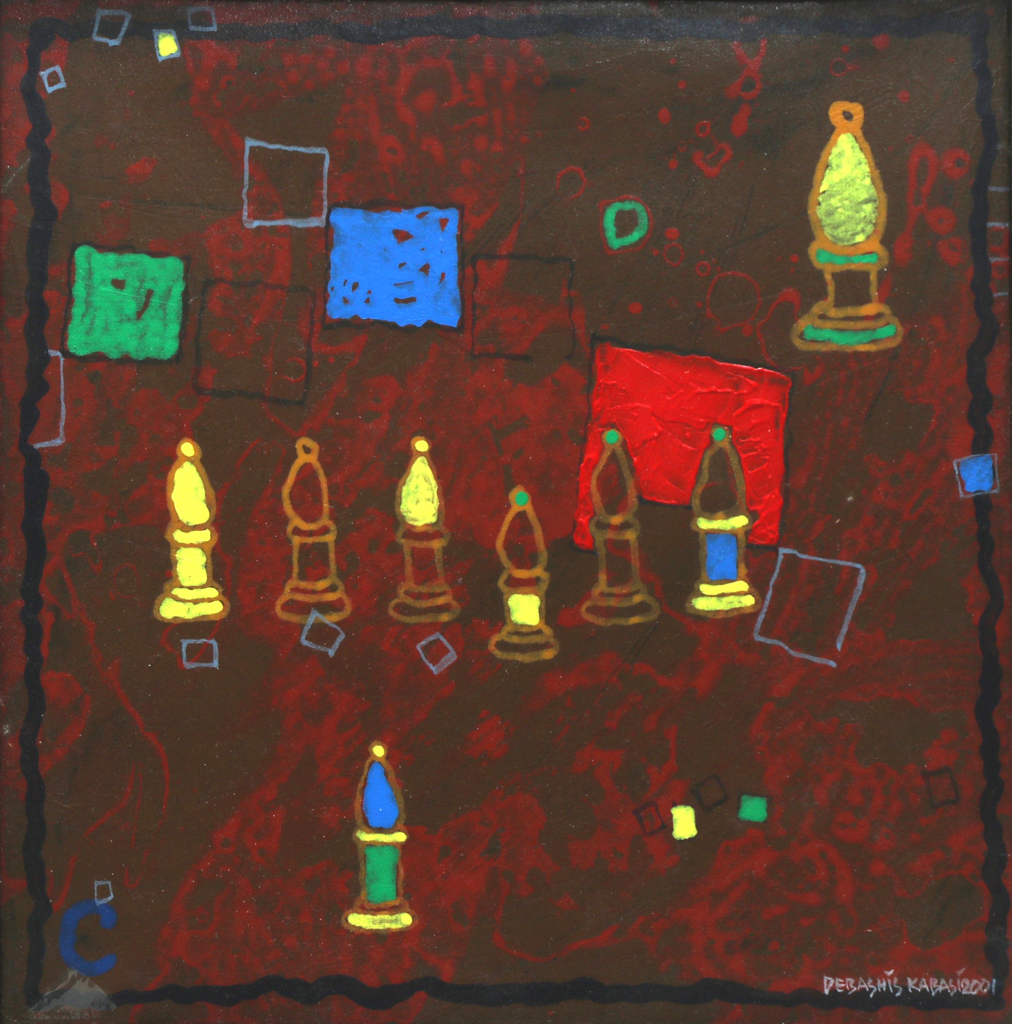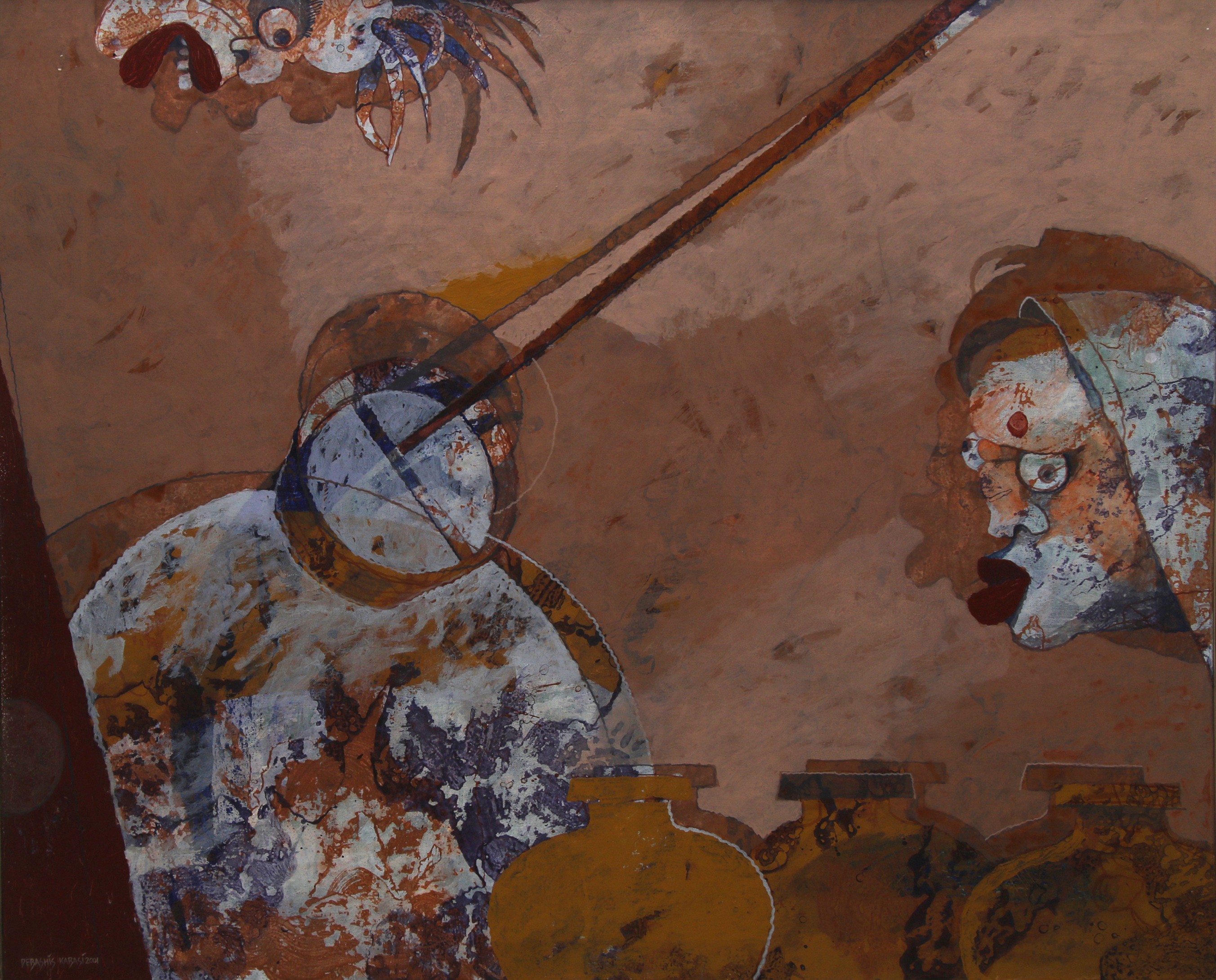 After he finishes painting his colourful works, Kabasi adds dark, shaky lines around the figures. It's like a child altering an adult's drawing. This mix of styles is a key part of his art. He starts with playful doodles and then refines them into clear shapes and outlines. The contrasting styles come together to make the art more balanced. The initial doodles often remain visible within the final piece, creating an abstract layer that overlays the figurative scene. He has exhibited his work in many solo and group shows in India and abroad.