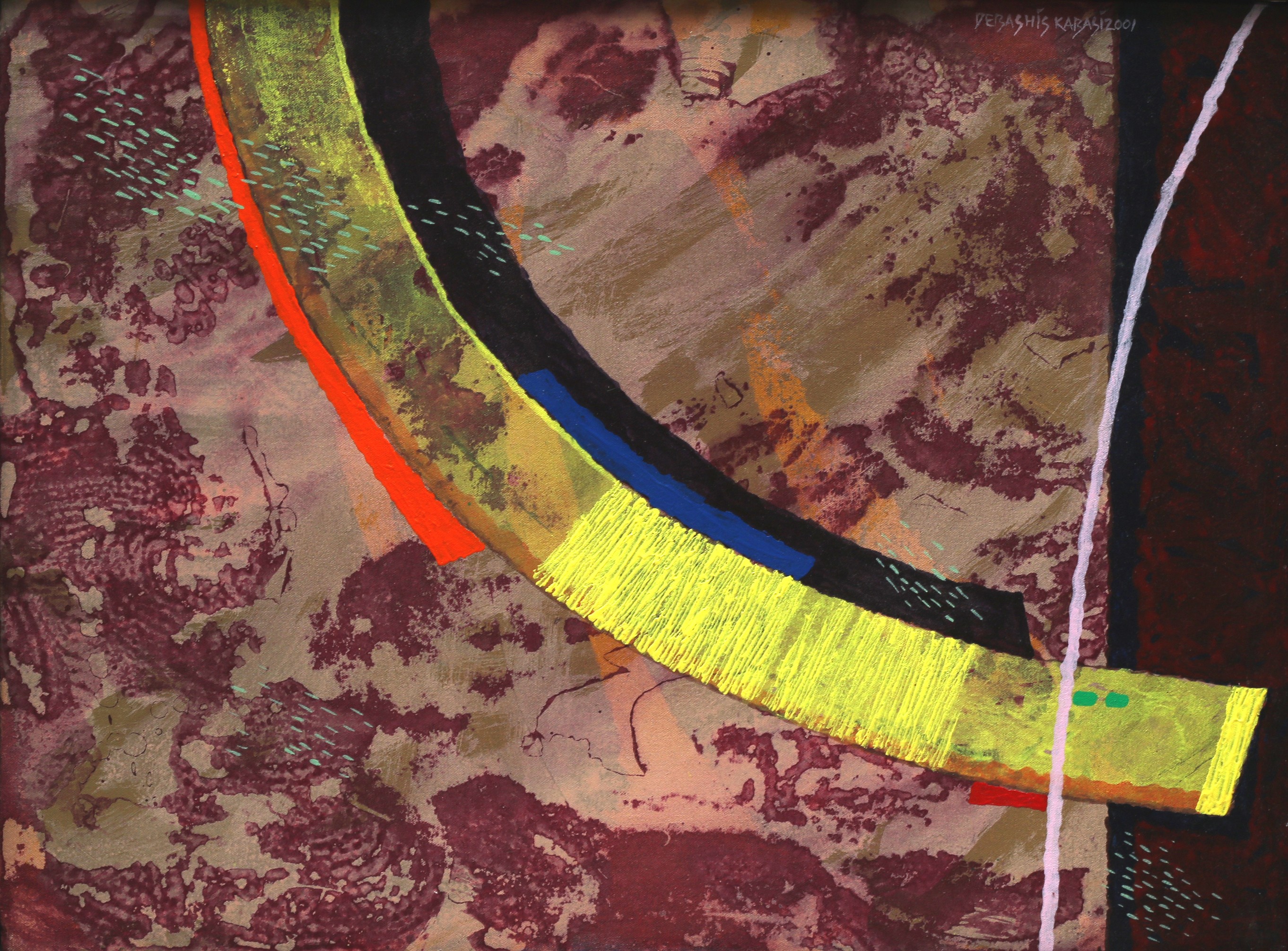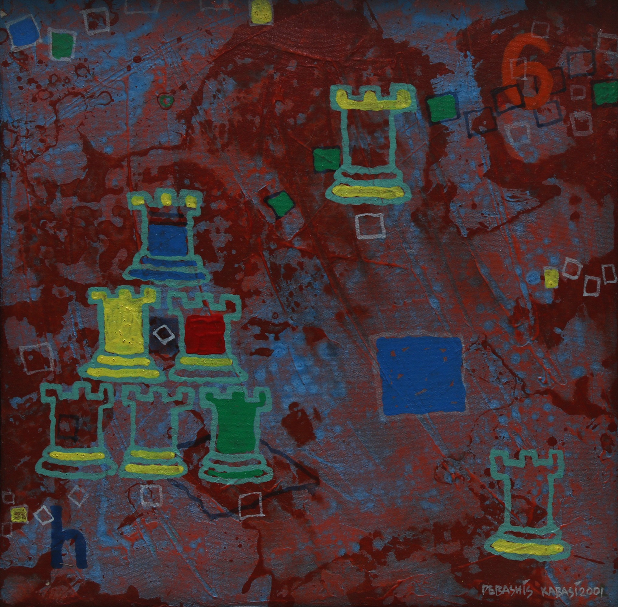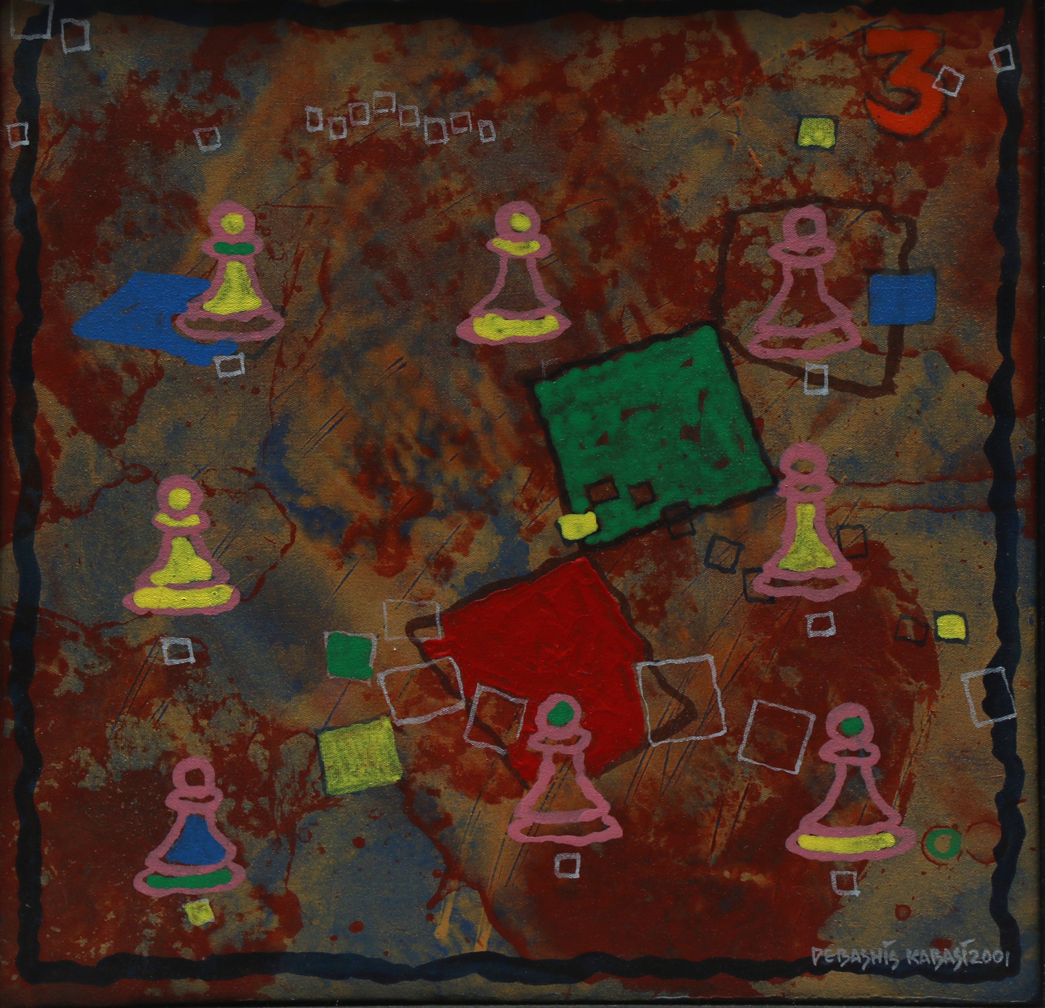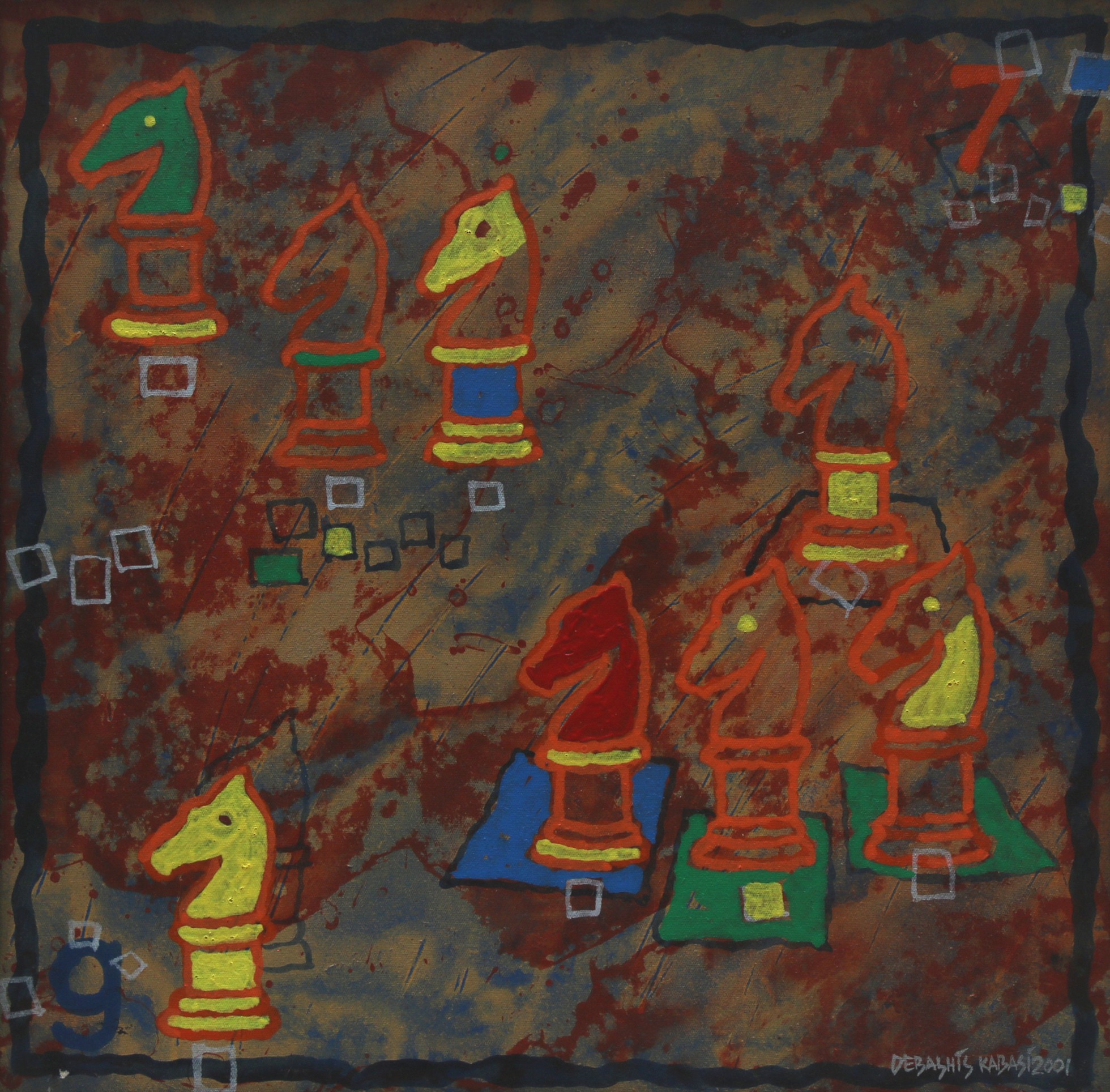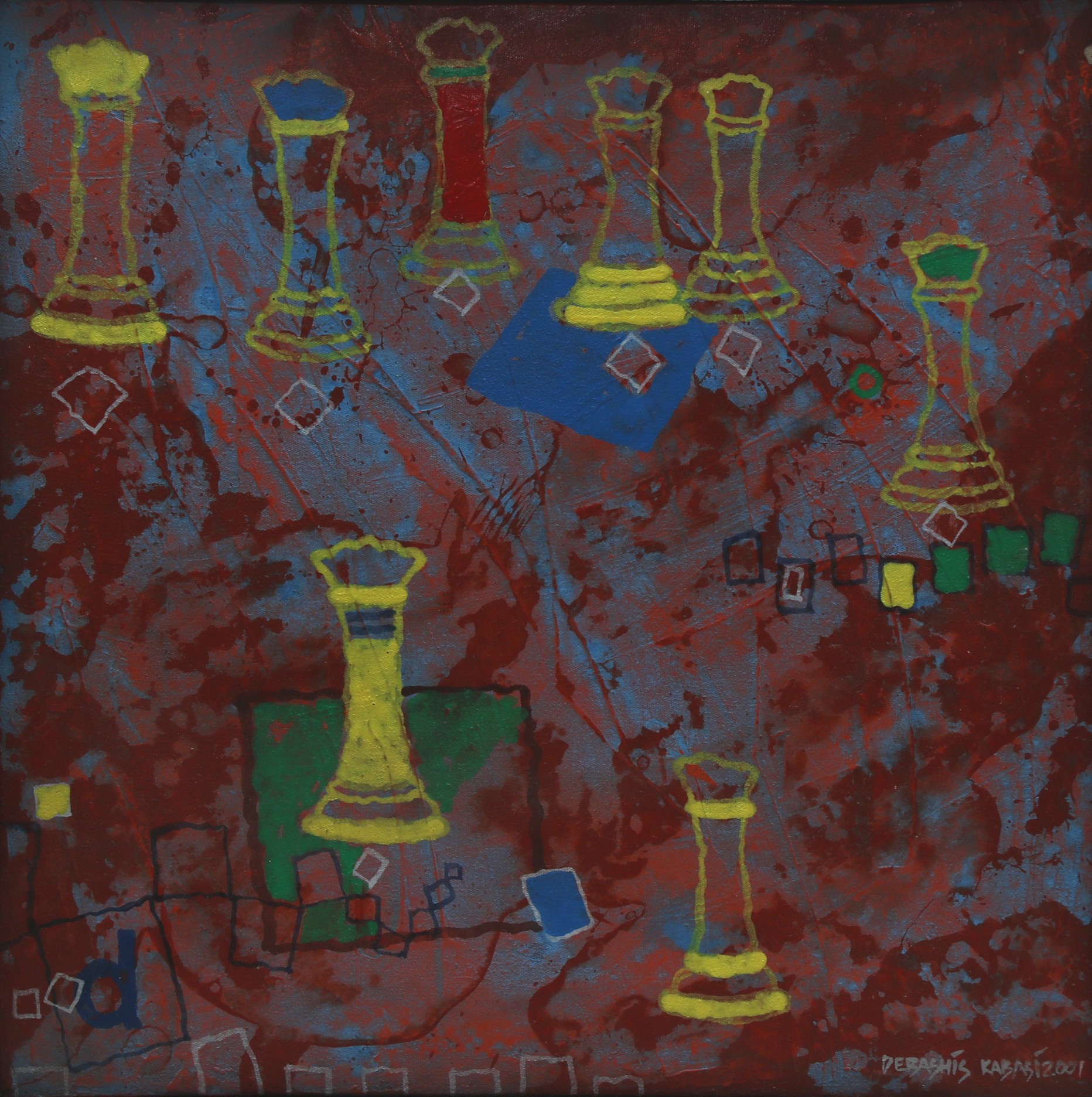 Kabasi uses similar colours to his twin brother Ashis Kabasi but his work is unique with vibrating outlines and dynamic gestures. He focuses on his generation's issues, like split personalities and keeping up with change. He explores textures and abstract art inspired by nature and continues to seek new painting techniques and surface treatments.
