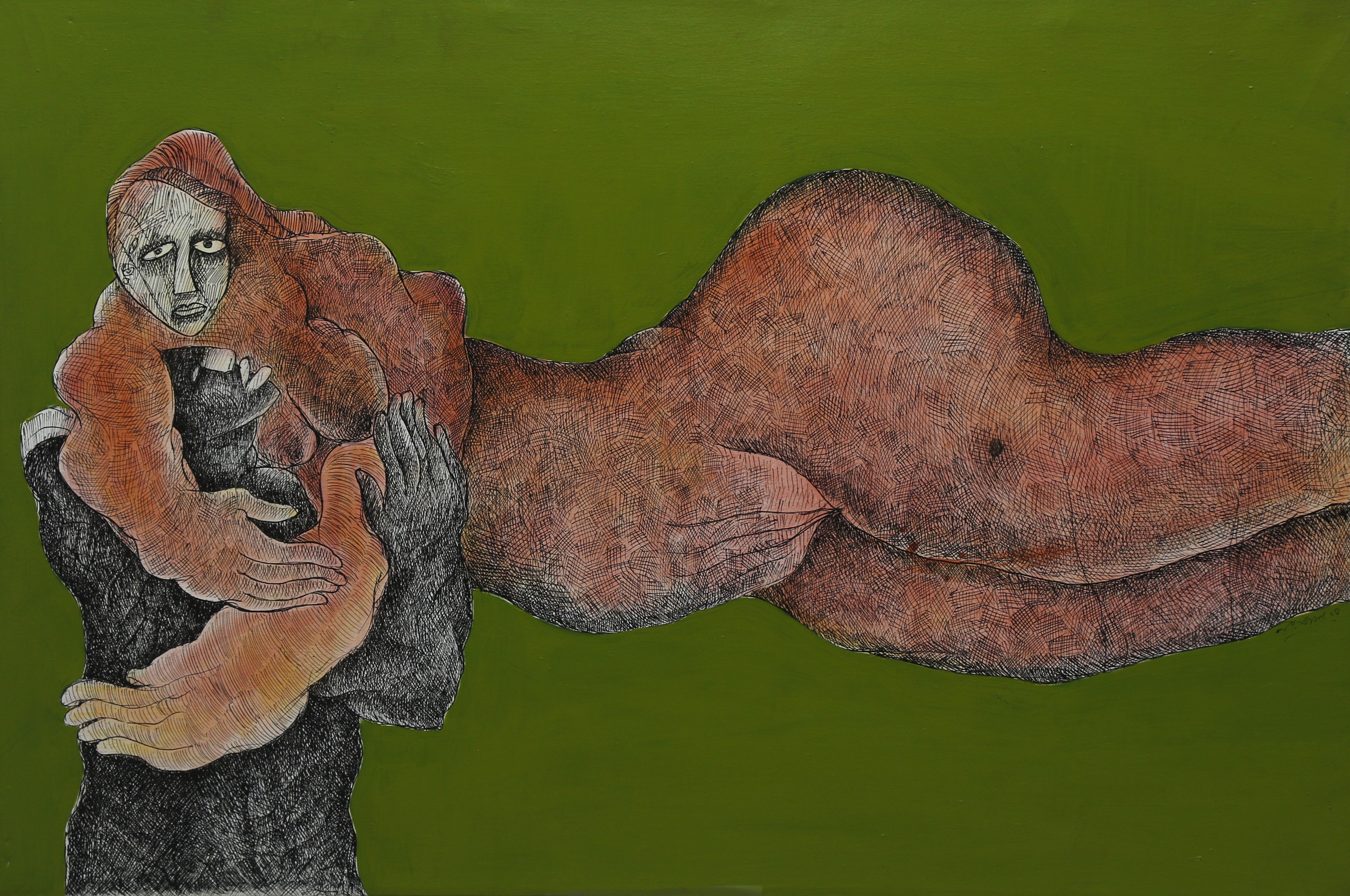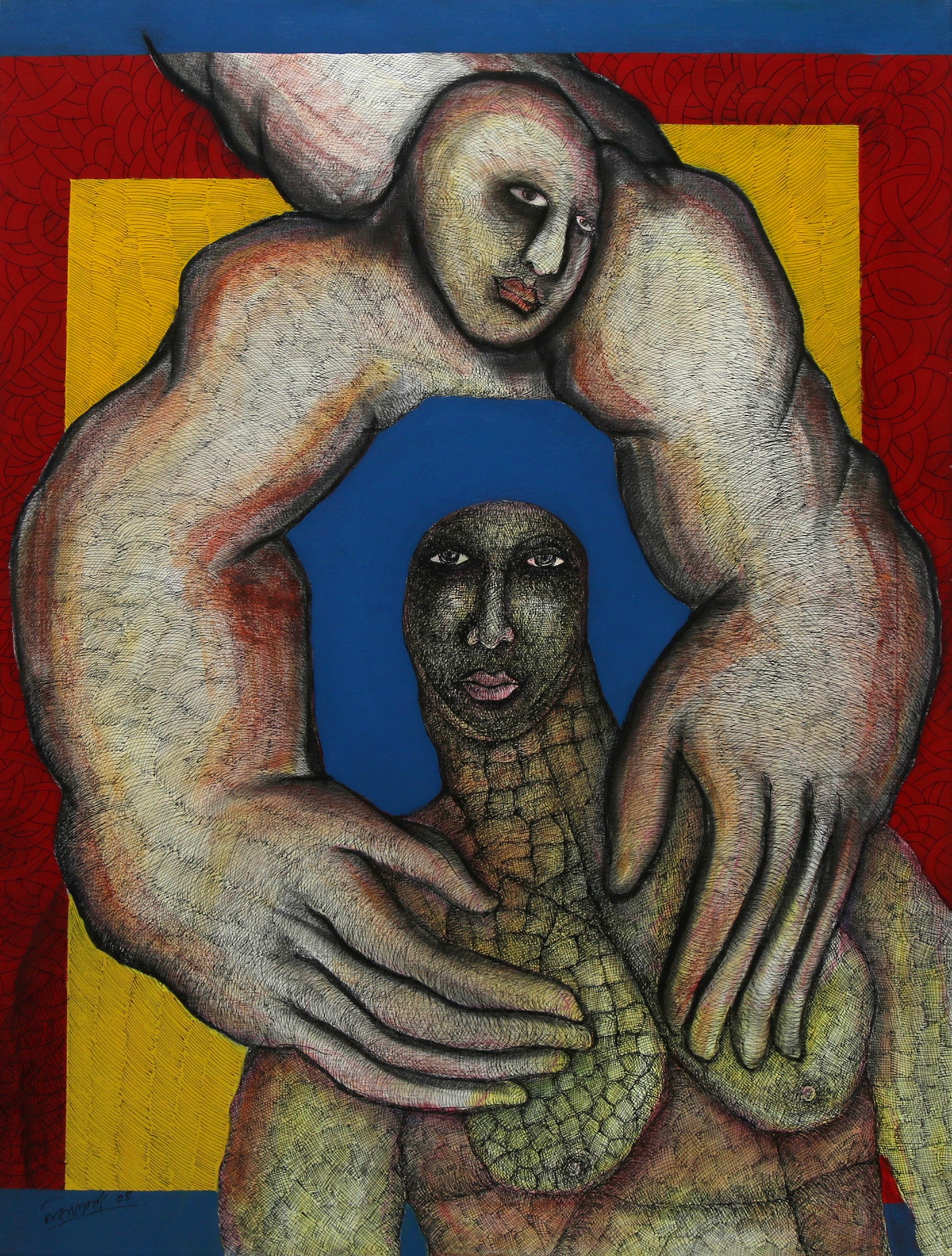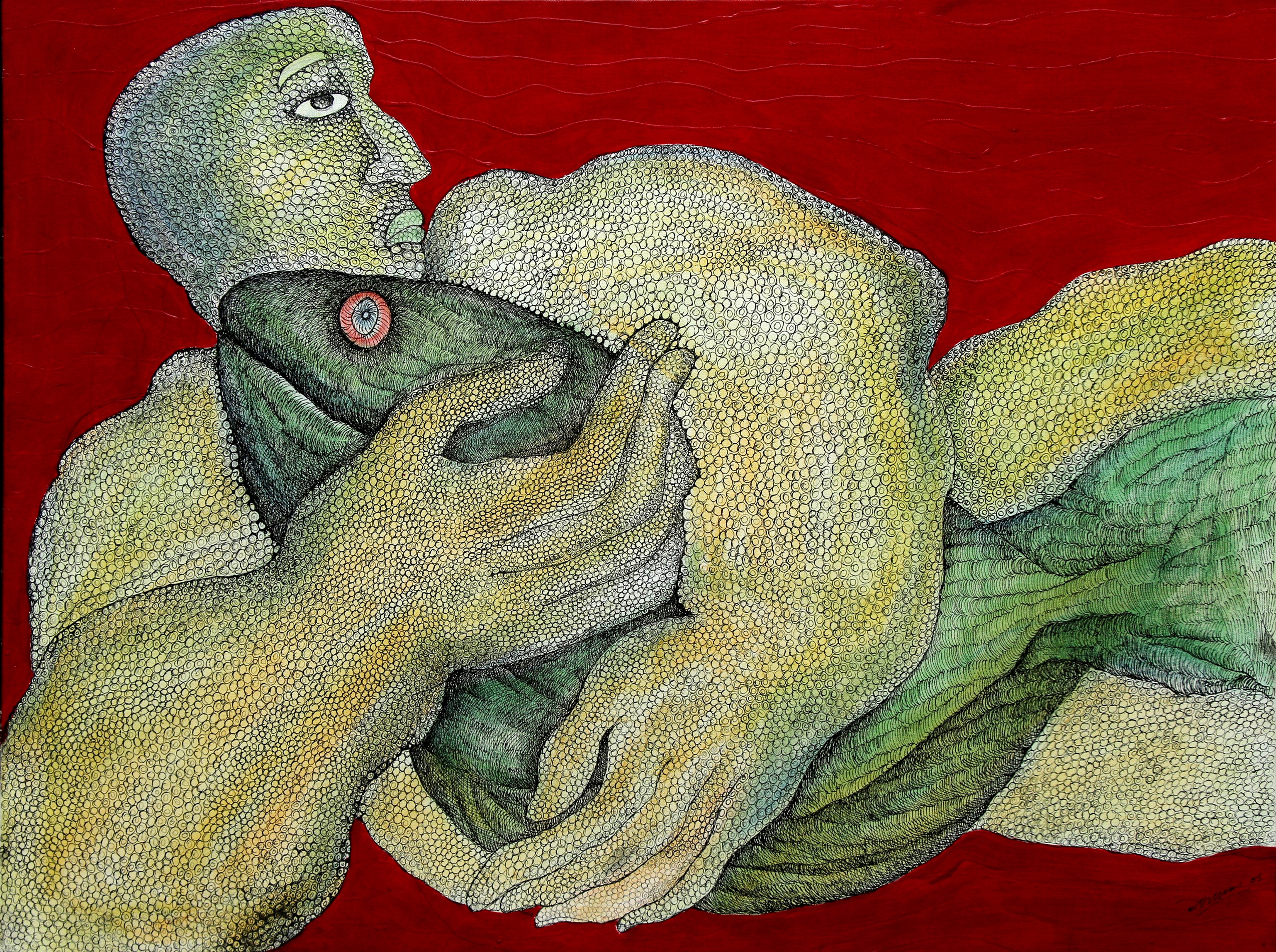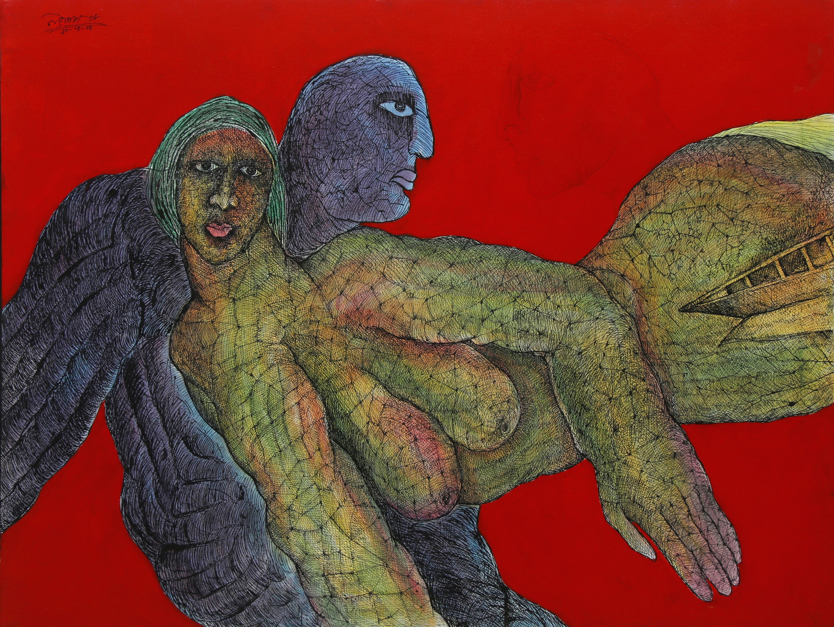 Das experiments with various mediums such as, acrylics, watercolours, pens and inks, and mixed media on acid-free papers and canvases. Most of his works are figurative, depicting humans in semi-abstract forms. His works often represent dreamy or fantasy and surrealistic styles, connecting with inner souls and thoughts. His compositions typically feature decorative and geometrical patterns, along with insects like butterflies, animals, fishes, flora and birds, also depicting human connections. However, all the figures show sadness and are going through some kind of mental trauma or inner disturbance in his paintings. His colour palette is vibrant and bright. All the human figures are filled with different patterns, which are also present in the background.