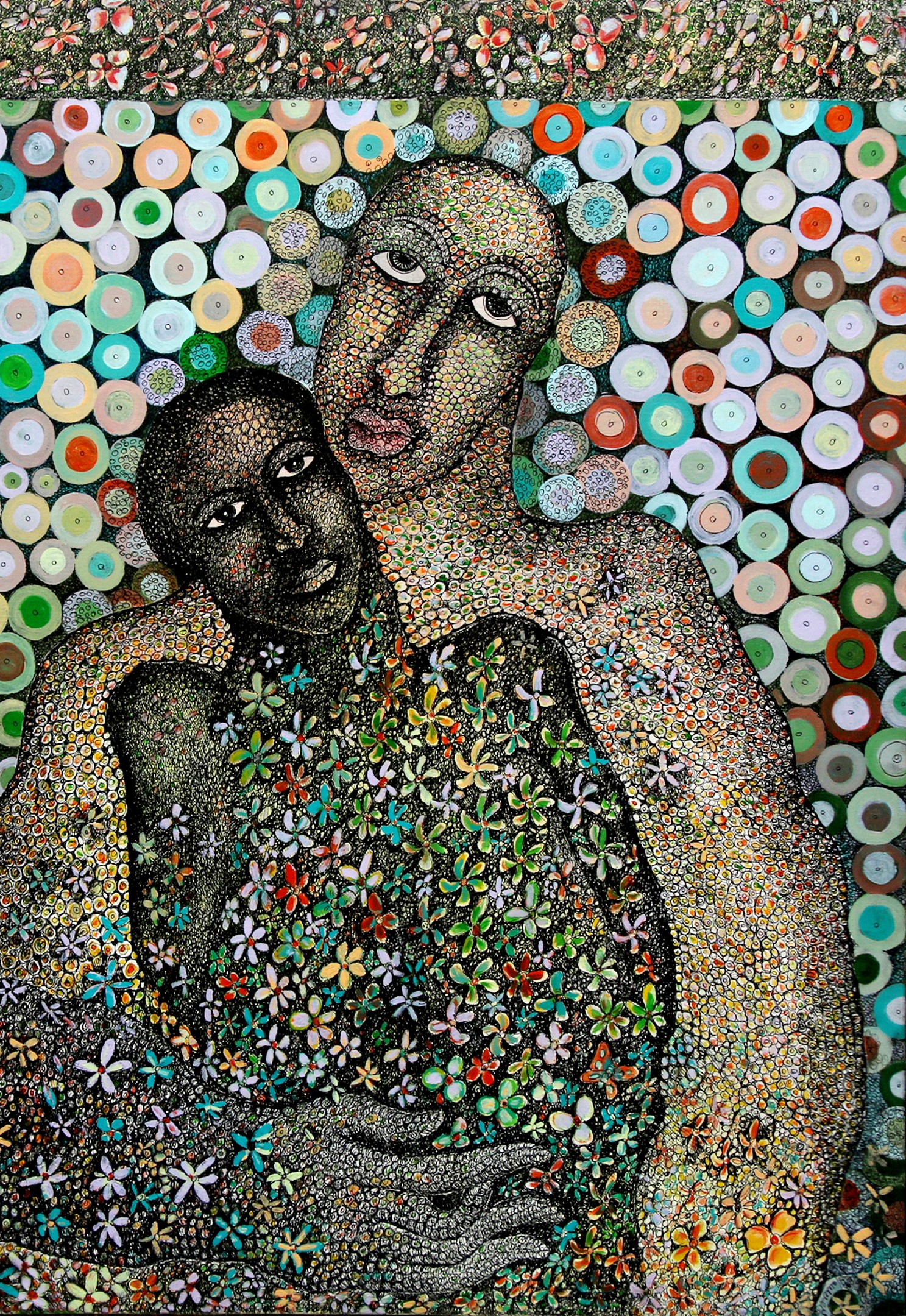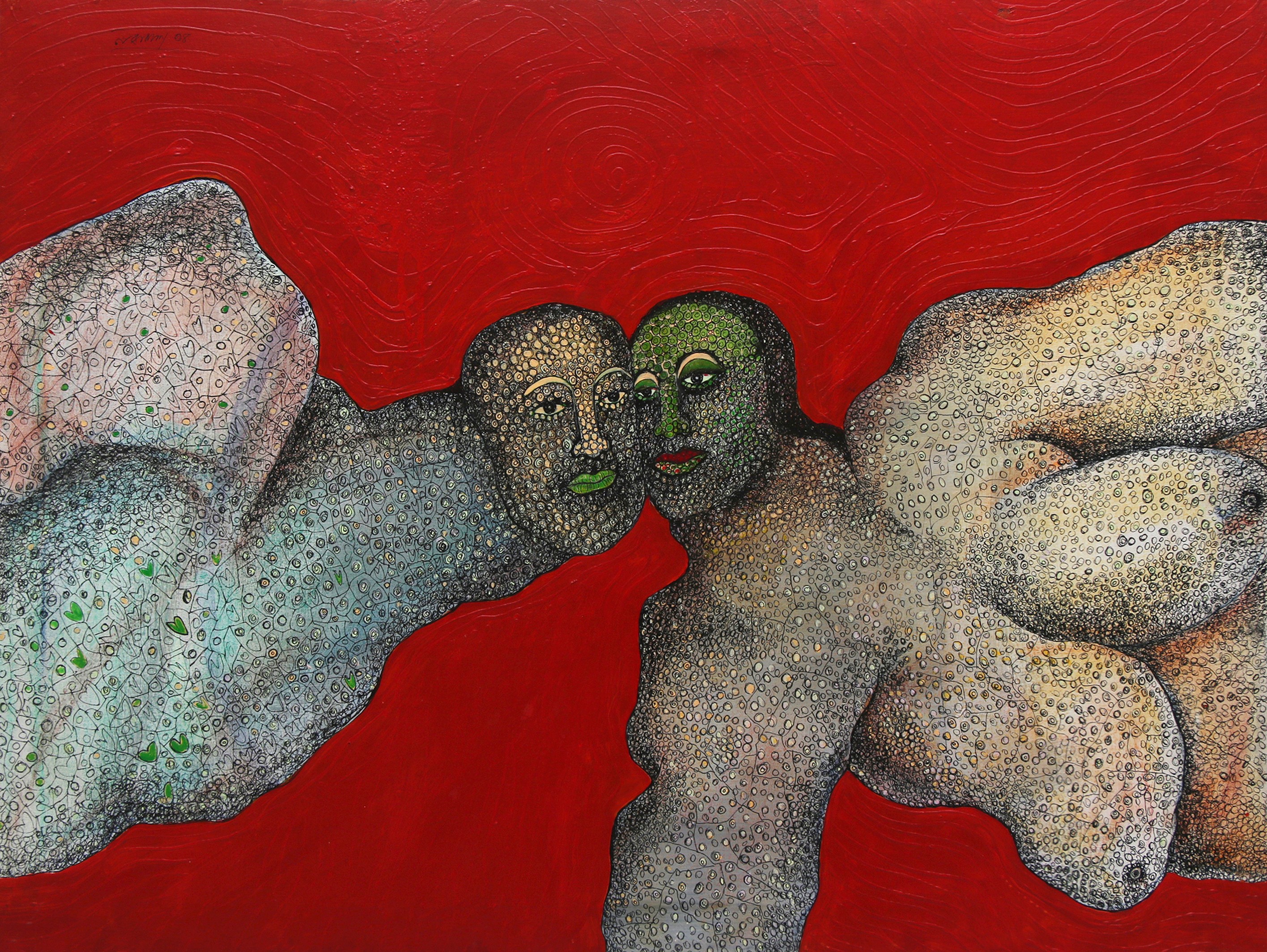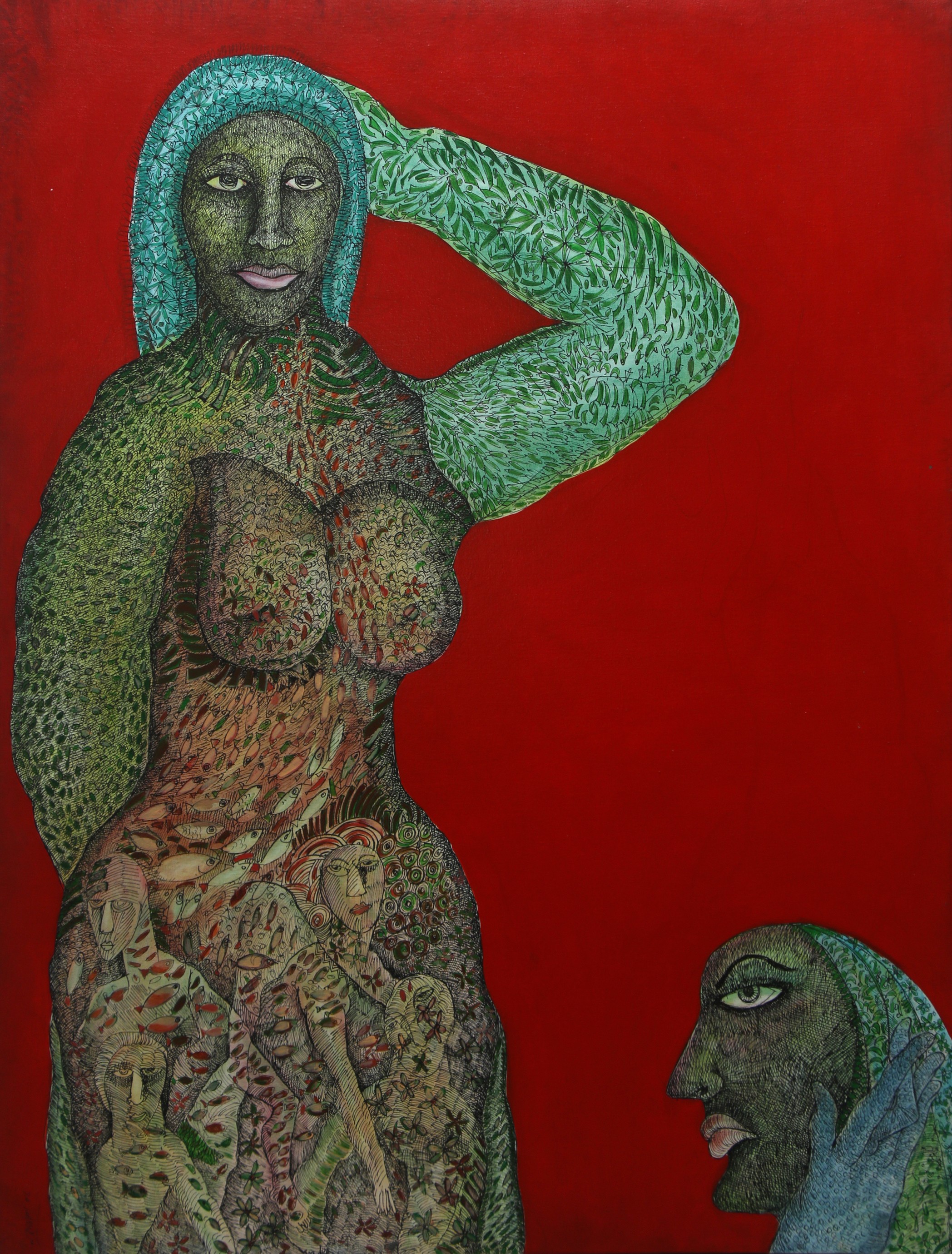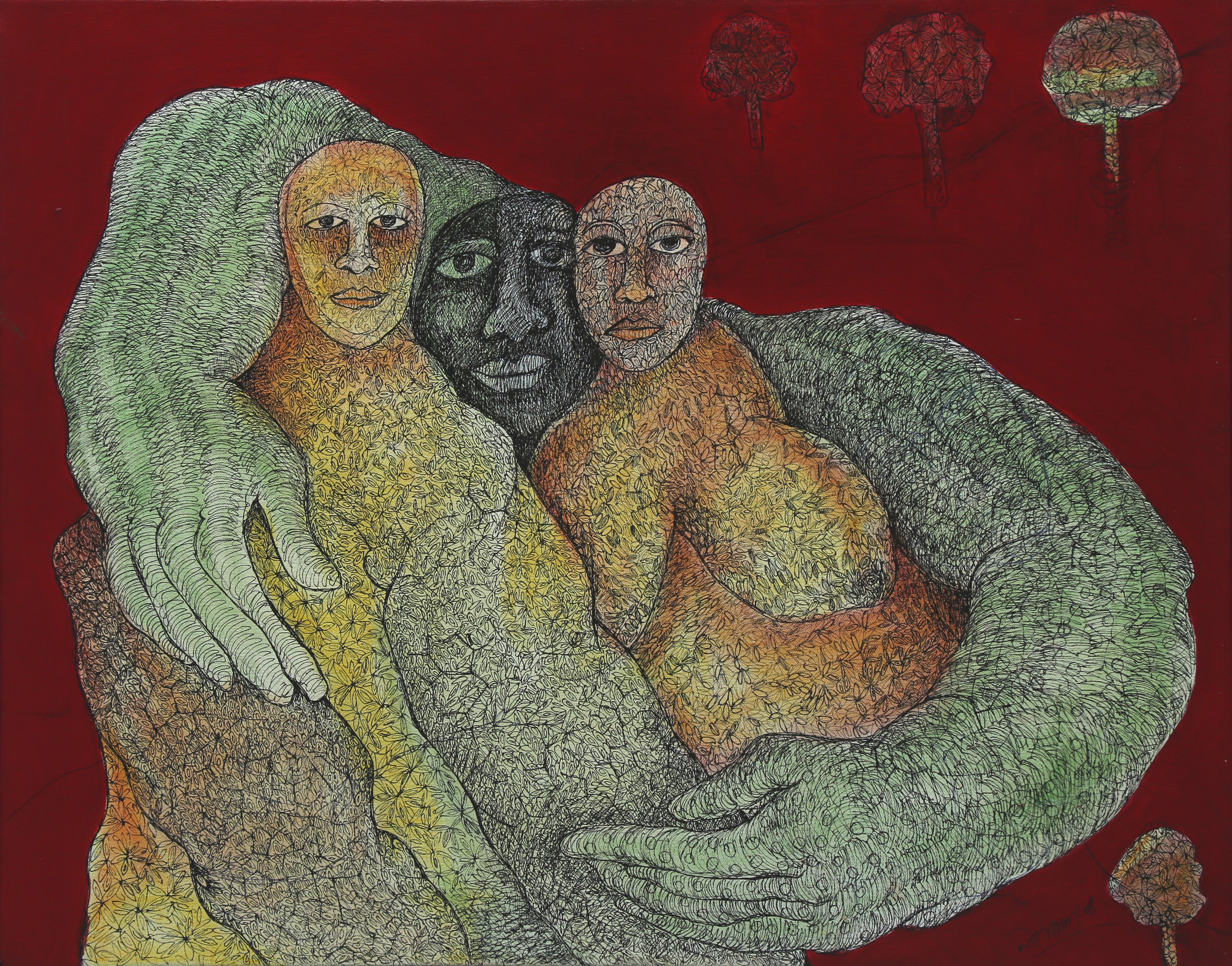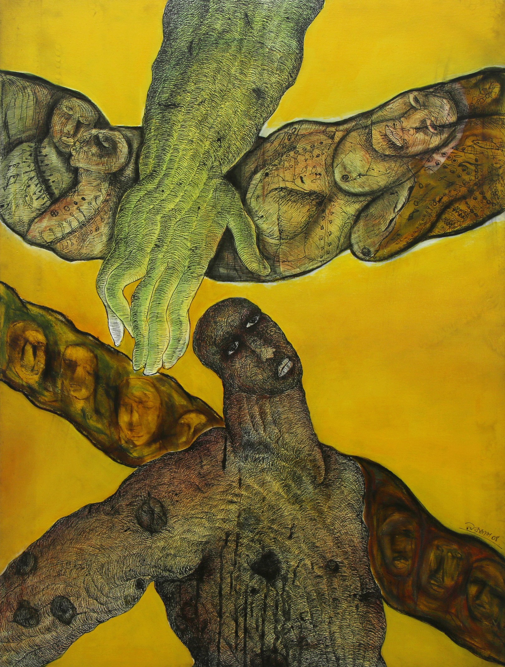 Das experiments with various mediums such as, acrylics, watercolours, pens and inks, and mixed media on acid-free papers and canvases. Most of his works are figurative, depicting humans in semi-abstract forms. His works often represent dreamy or fantasy and surrealistic styles, connecting with inner souls and thoughts. His compositions typically feature decorative and geometrical patterns, along with insects like butterflies, animals, fishes, flora and birds, also depicting human connections. However, all the figures show sadness and are going through some kind of mental trauma or inner disturbance in his paintings. His colour palette is vibrant and bright. All the human figures are filled with different patterns, which are also present in the background.