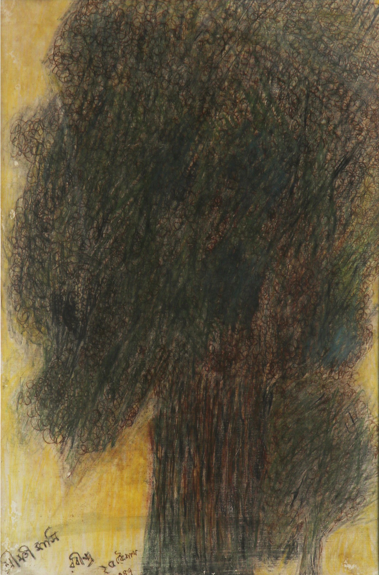 Tagore started creating art later in life, at the age of 63. Despite this, he painted nearly 2,500 artworks in the few years he was an artist and he did not have formal training in art. In most of his paintings, he used dark colours and bright highlights. For him, painting felt like a burst of newfound freedom, so he used various materials. He preferred using ink, watercolour, crayon, pen, and even his fingertips. Form, composition, rhythm, and vibrant energy were key elements of his artistic style. His paintings feature intense, semi-expressionist faces of men and women living in a twilight world and a dreamy landscape. These paintings express hidden emotions and a deep, thoughtful inner world. They don't connect to any specific national style but belong to a modern, international approach to painting. His artworks continued the style he developed with his Santiniketan landscapes in the 1930s but also marked a new direction. They are often expansive, and usually in ink on paper, offering a different sense of space compared to his earlier landscapes. His final series of drawings, made in the early 1960s, showed a shift toward abstraction and a very simple style. His paintings and drawings reflected the influence of artists such as Wassily Kandinsky, Paul Klee, Gerhard Marx, Georg Muche, Nicholas Roerich.