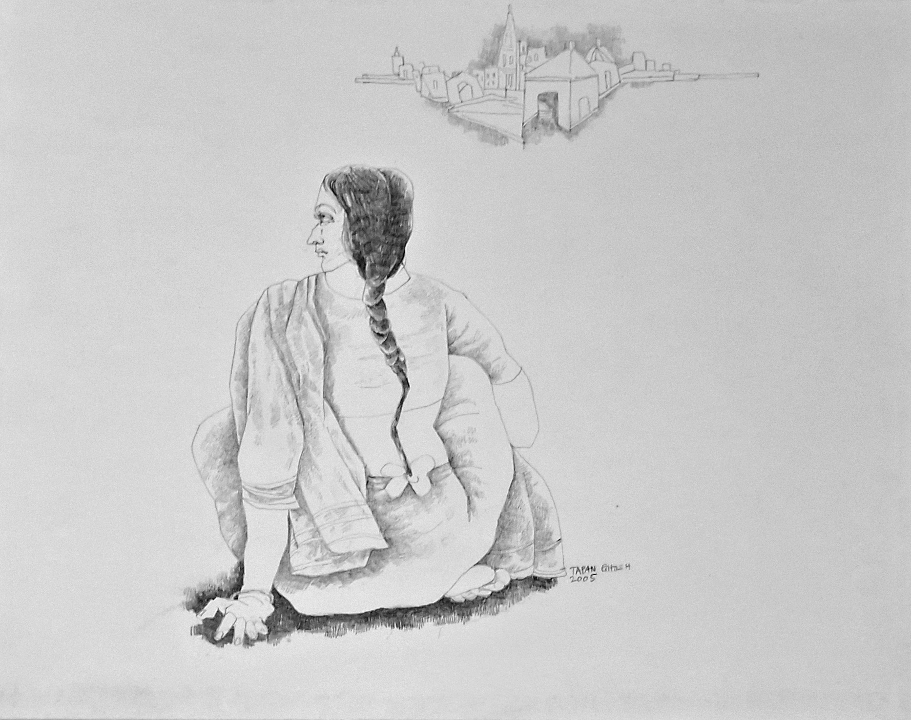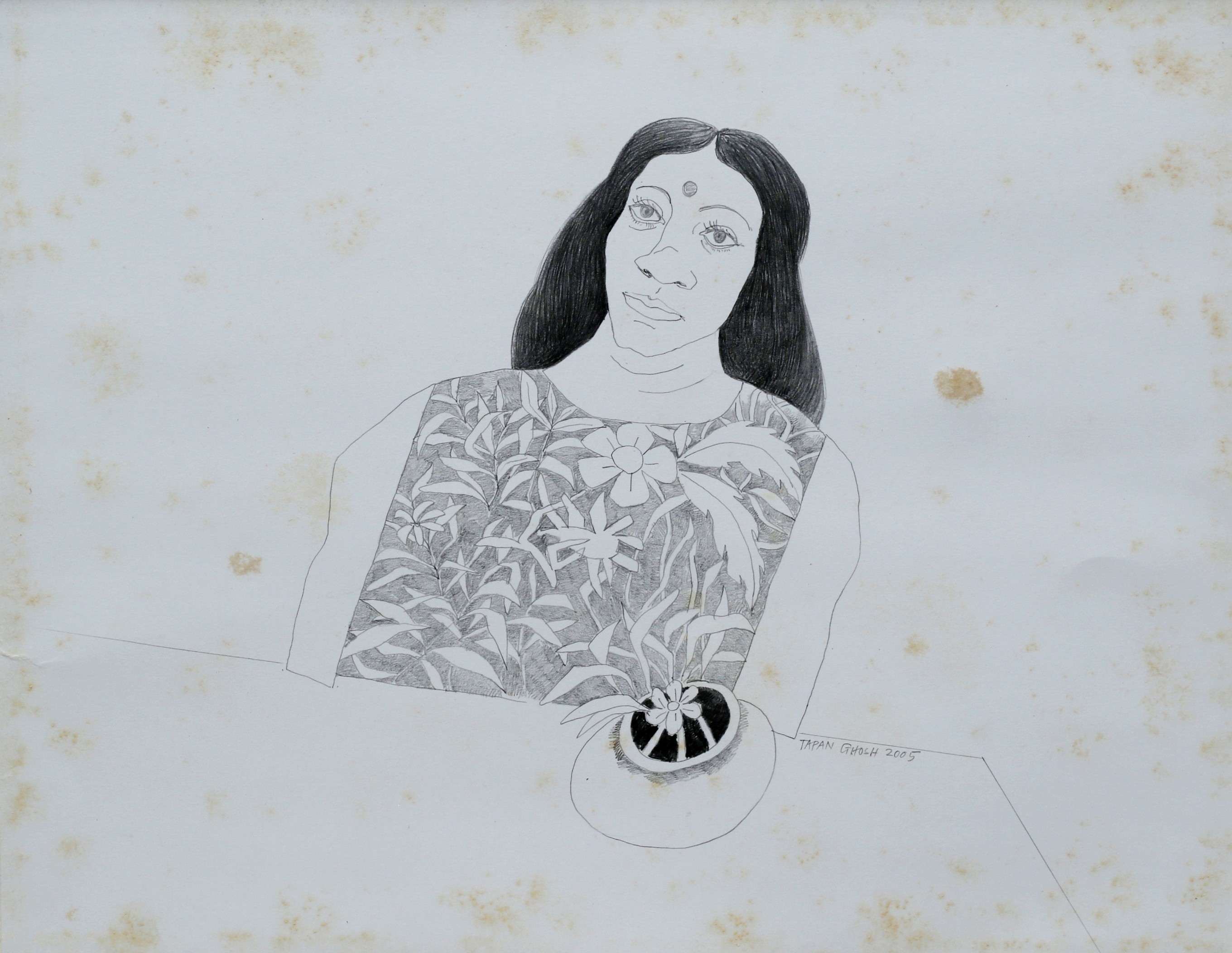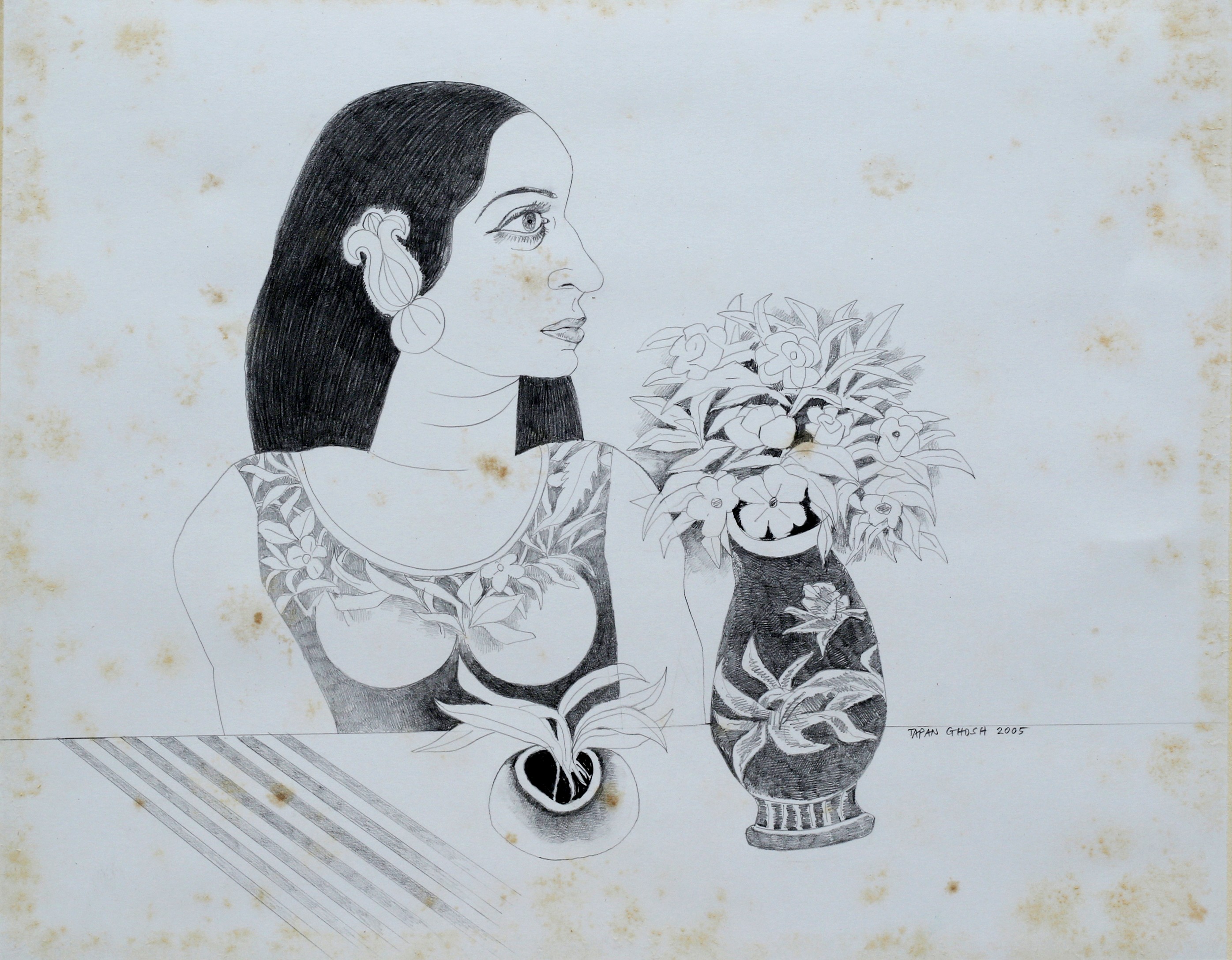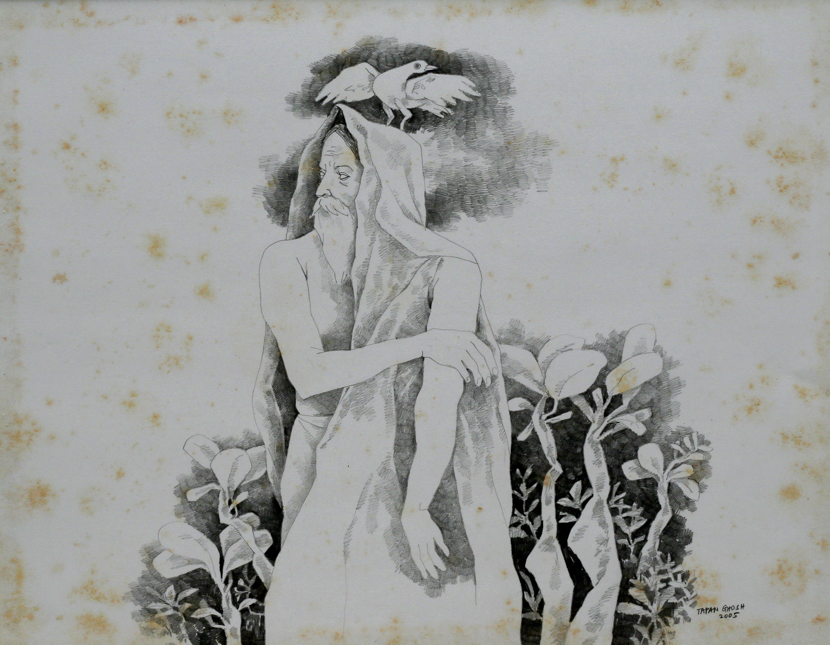 His early works often depicted scenes from rural Bengal, capturing the essence of daily life with a blend of realism and a touch of abstraction. His work often reflects a deep connection to Indian culture and heritage, blending traditional themes with contemporary techniques and the style has also evolved over the years from an abstract expression to a figurative one. Many of his drawings, especially those of people's faces, have a strong sense of Romanticism. The faces seem to appear suddenly, as if drawn with quick, flowing strokes. Ghosh’s mastery of different mediums allowed him to experiment with textures, colors, and techniques, enriching his artistic palette. He worked in various mediums, including oil paints, watercolors, acrylics, and printmaking techniques such as etching and lithography, and also, various works in pencil with confidence on pencil works.