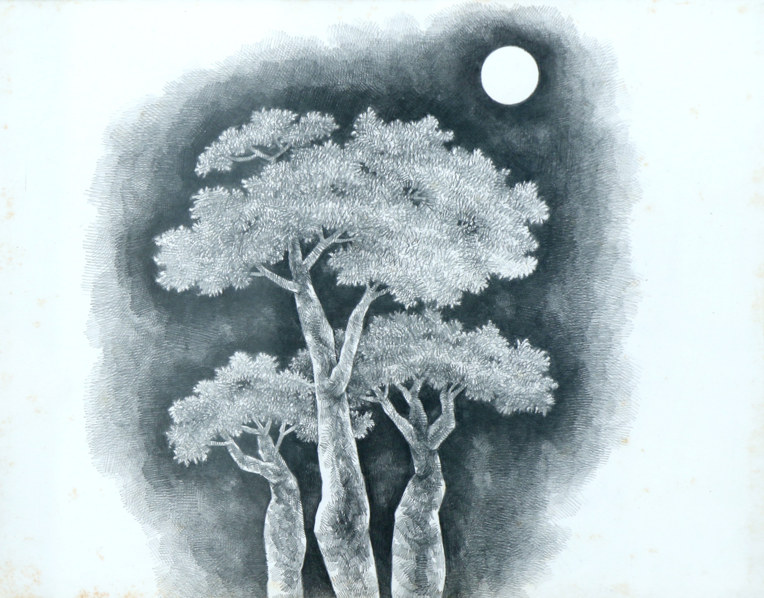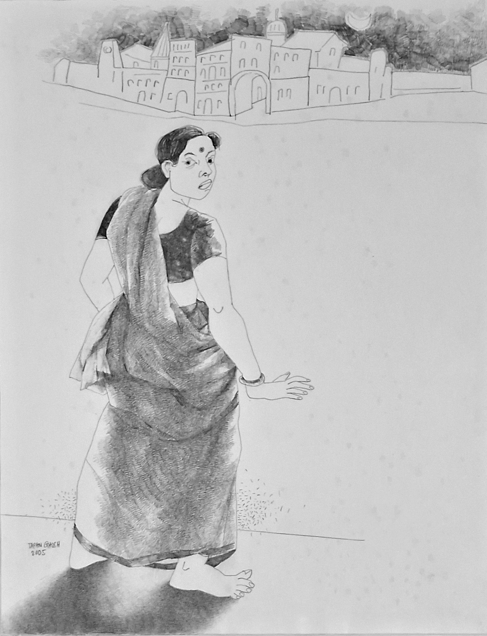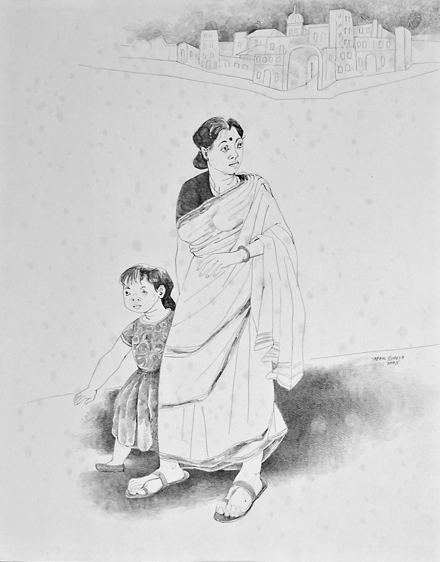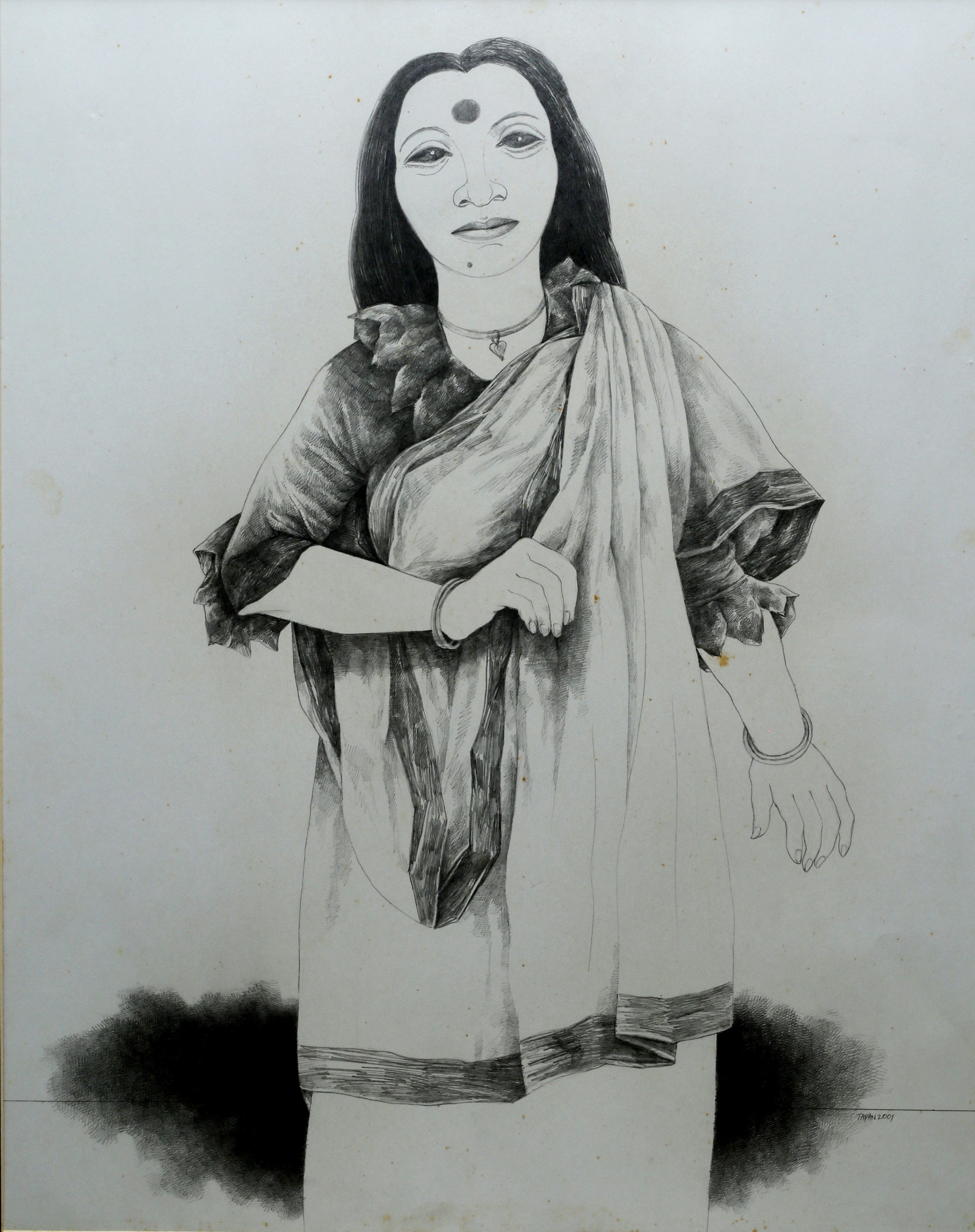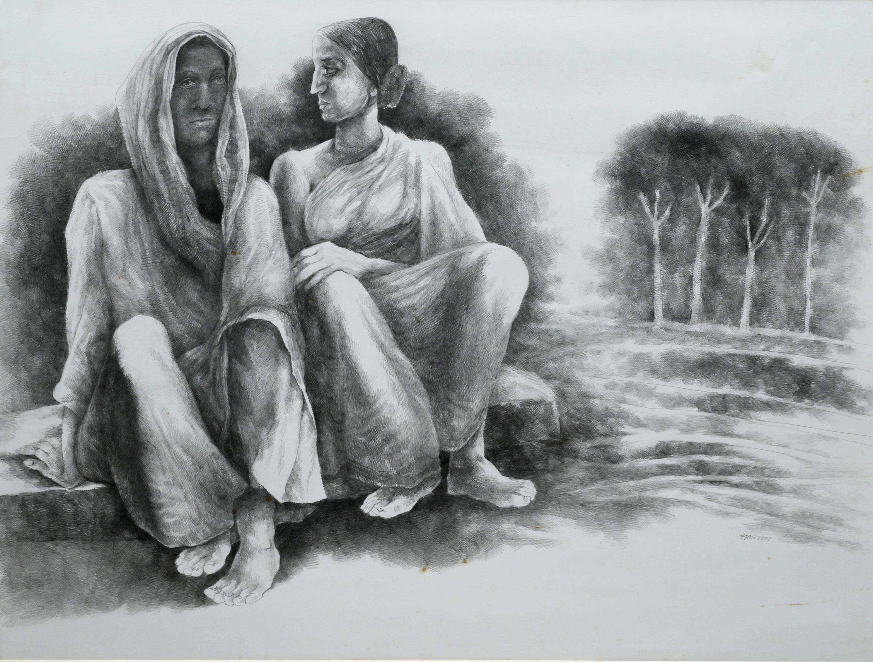 His early works often depicted scenes from rural Bengal, capturing the essence of daily life with a blend of realism and a touch of abstraction. His work often reflects a deep connection to Indian culture and heritage, blending traditional themes with contemporary techniques and the style has also evolved over the years from an abstract expression to a figurative one. Many of his drawings, especially those of people's faces, have a strong sense of Romanticism. The faces seem to appear suddenly, as if drawn with quick, flowing strokes. Ghosh’s mastery of different mediums allowed him to experiment with textures, colors, and techniques, enriching his artistic palette. He worked in various mediums, including oil paints, watercolors, acrylics, and printmaking techniques such as etching and lithography, and also, various works in pencil with confidence on pencil works.